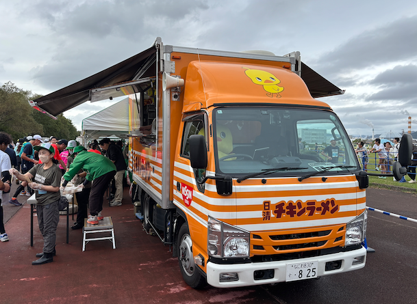 33km付近の「大エイドステーション」チキンラーメンがお出迎え!から揚げ、スープ、だんご、こんにゃく、サイダーなど20種類以上はあるかという食べ物&飲み物!知らなかったけど「しまだマラソン名物」でした!チキンラーメン、美味しかった!